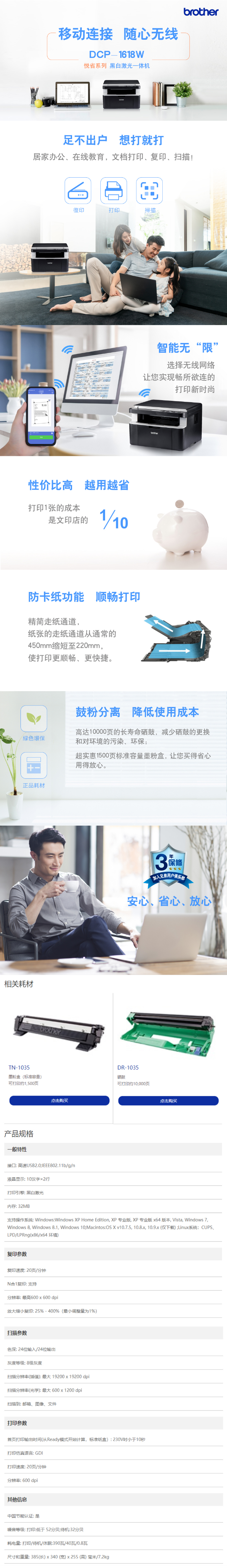 - 商品名稱:兄弟(brother)DCP1618W A4黑白激光多功能一體機(jī) 打印/復(fù)印/掃描 無線網(wǎng)絡(luò)打印 20頁(yè)/分鐘 手動(dòng)雙面打印 鼓粉分離 適用耗材:TN-1035/DR-1035 600dpi 一年保修
