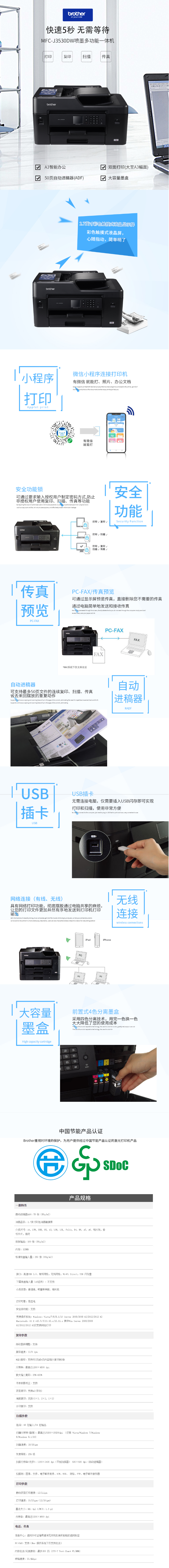 - 商品名稱:兄弟(brother)MFC-J3530DW A3彩色噴墨多功能一體機 自動雙面打印/復(fù)印/掃描/傳真 支持無線/有線網(wǎng)絡(luò)打印 35/27ppm 適用耗材:LC3919 1200×4800dpi 一年保修