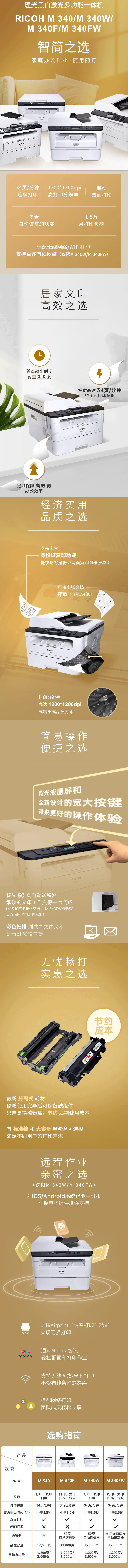 • 商品名稱:理光(Ricoh)M 340FW A4黑白激光四合一多功能一體機(雙面打印/復印/掃描/傳真/有線/無線)