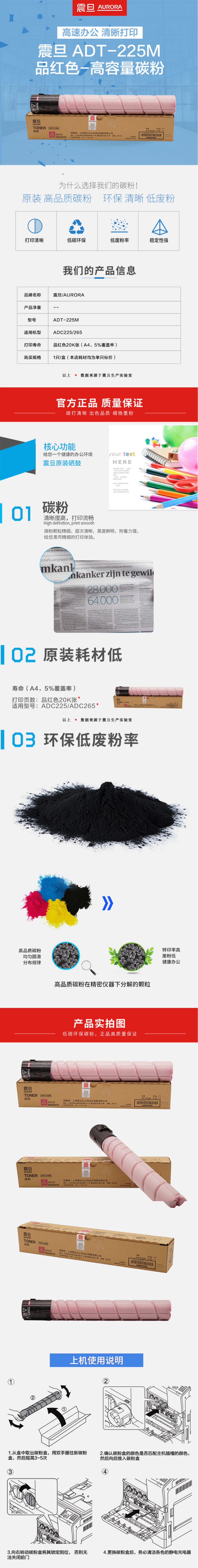 • 商品名稱:震旦(AURORA)ADT-225M品紅色-高容量碳粉(適用ADC225/265系列機(jī)型)約20000頁(yè)