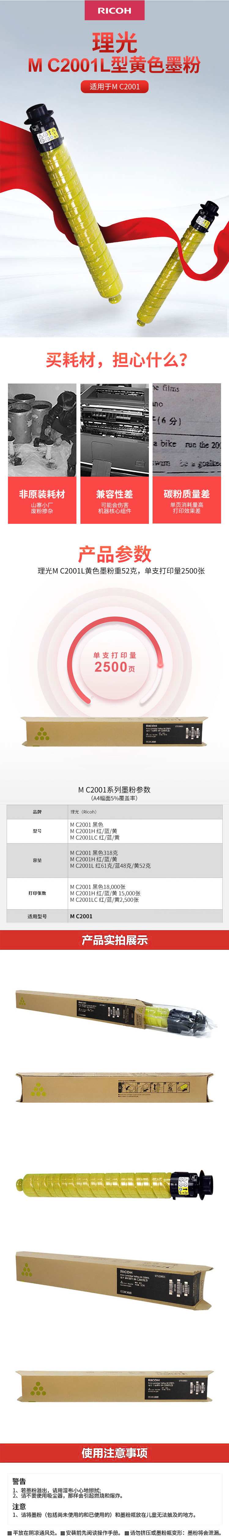 • 商品名稱:理光(Ricoh)M C2001L 黃色墨粉盒 適用于M C2001(2,500張)