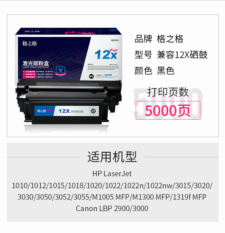 • 商品名稱:格之格 NT-PH2612XXplus+ 黑色硒鼓5000頁印量 適用于HP LaserJet 1010/1012/1015/1018/1020/1022/1022n/1022nw/3015/3020/3030/3050/3052/3055/M1005 MFP/M1300 MFP/1319f MFP Canon LBP2900/LBP2900+/LBP3000