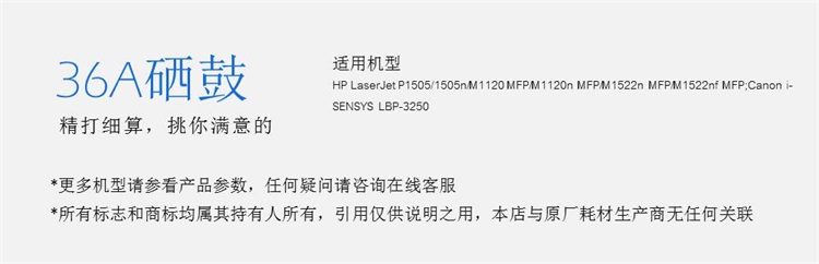 • 適用機(jī)型:HP LaserJet P1505/1505n/M1120 MFP/M1120n MFP/M1522n MFP/M1522nf MFP;Canon i-SENSYS LBP-3250