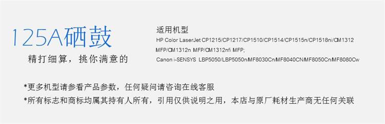 • 適用機(jī)型:適用于HP Color LaserJet CP1215/CP1217/CP1510/CP1514/CP1515n/CP1518ni/CM1312 MFP/CM1312n MFP/CM1312nfi MFP; Canon i-SENSYS LBP5050/LBP5050n/MF8030Cn/MF8040CN/MF8050Cn/MF80