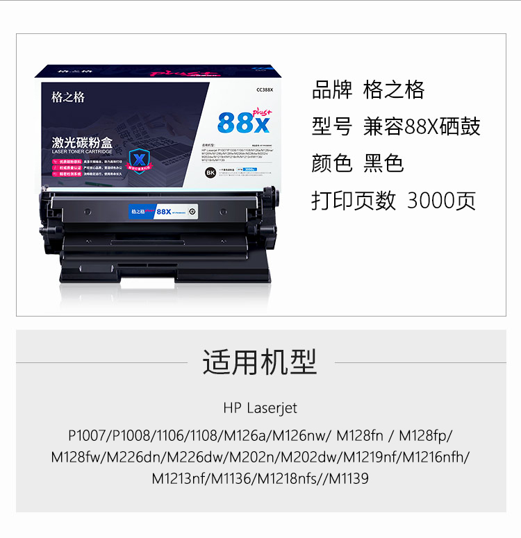 格之格 NT-PH388XXCplus+黑色硒鼓 3000頁印量 適用于HP Laserjet P1007/P1008/1106/1108/M126a/M126nw/ M128fn / M128fp/M128fw/M226dn/M226dw/M202n/M202dw/M1219nf/M1216nfh/M1213nf/M1136/M1218nfs//M1139