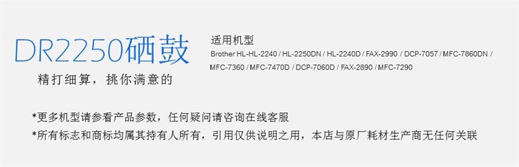 • 適用機(jī)型:Brother HL-HL-2240 / HL-2250DN / HL-2240D / FAX-2990 / DCP-7057 / MFC-7860DN / MFC-7360 / MFC-7470D / DCP-7060D / FAX-2890 / MFC-7290