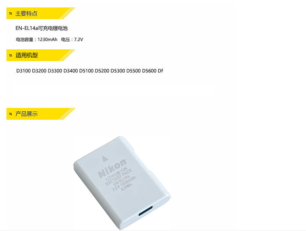 • 商品名稱:尼康(Nikon)EN-EL14a 單反原裝電池 適用D5600/D5500/D5300/D3400/D3300