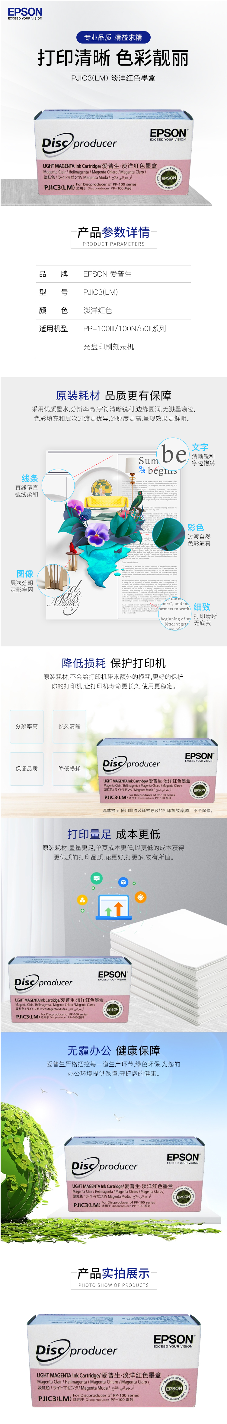 • 商品名稱:愛普生(EPSON)C13S020449 PJIC3淡洋紅色墨盒 適用PP-100III/100N/50II系列光盤印刷刻錄機(jī)