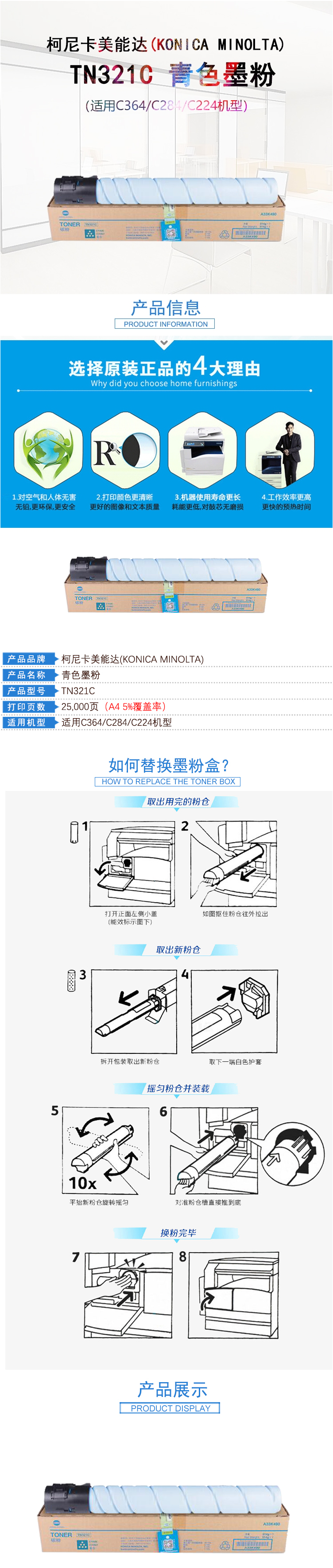 柯尼卡美能達(dá)(KONICAMINOLTA) TN321C 青色碳粉 適用于C224E/C284E/C364E 打印頁數(shù)25000頁