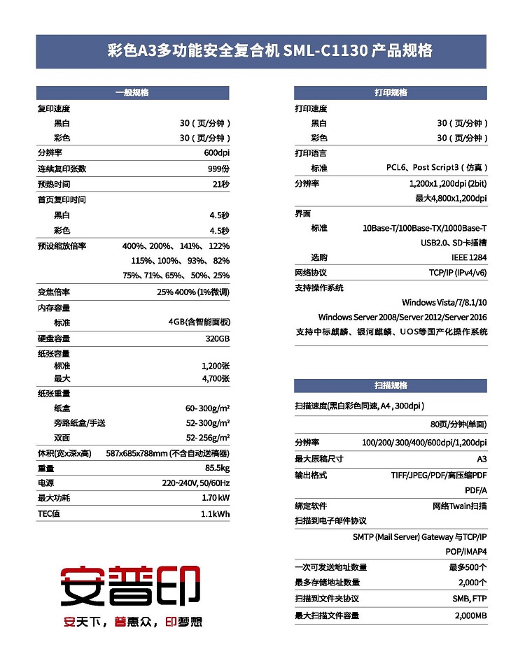 安普印 A3彩色激光數(shù)碼復(fù)合機(jī)SML-C1130 標(biāo)配主機(jī)+輸稿器+雙紙盒+工作臺