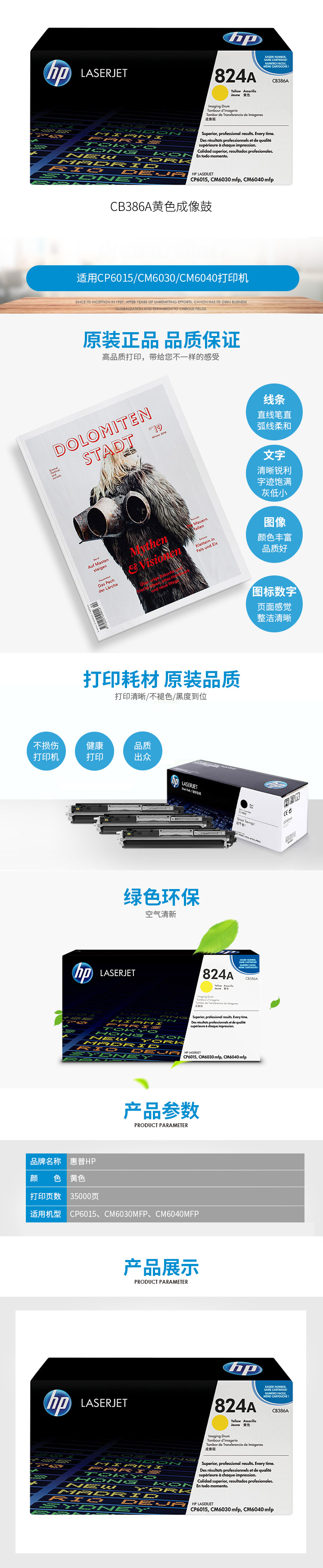 - 商品名稱:惠普(HP)824A 黃色成像鼓CB386A 打印量23000頁 適用于HP Color LaserJet CP6015 系列 HP Color LaserJet CM6030/6040 MFP 系列