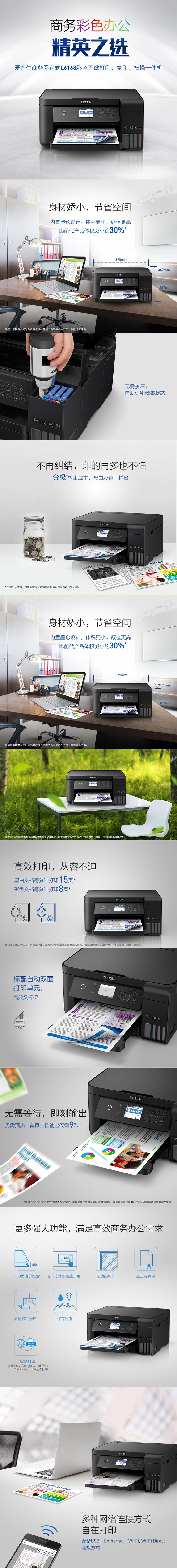 - 商品名稱:愛普生(EPSON)L6168 A4彩色噴墨多功能一體機(jī) 打印/復(fù)印/掃描 支持網(wǎng)絡(luò)打印 15頁/分鐘 自動(dòng)雙面打印 適用耗材EPSON 002 一年保修