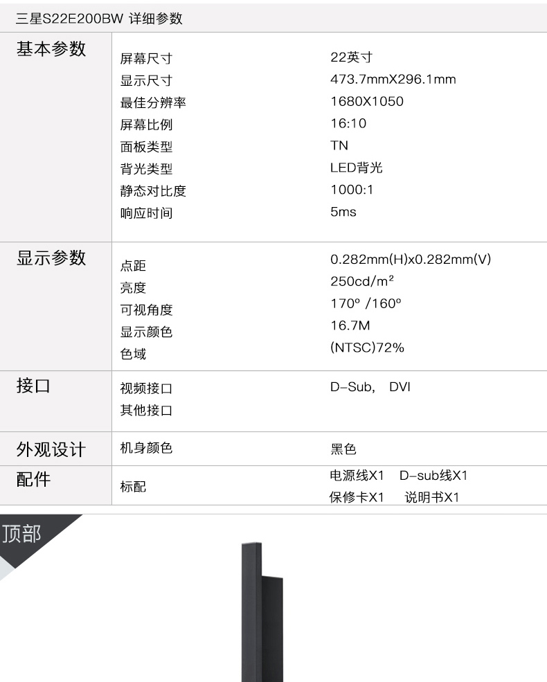• 商品名稱:三星(SAMSUNG) S22E200BW 22英寸 16:10屏幕LED商用液晶顯示器