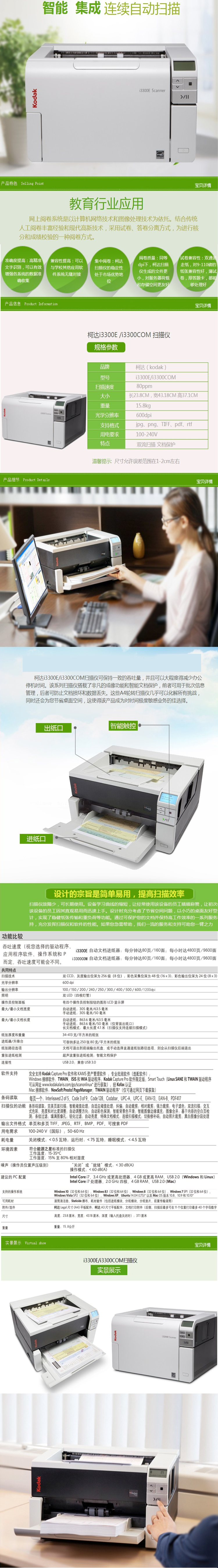 柯達(dá)(Kodak)掃描儀 i3300com雙進(jìn)紙方式,A3,CCD,600×600dpi 掃描速度:80ppm,雙面160ipm掃描范圍:216x863mm,日掃描量:20000頁