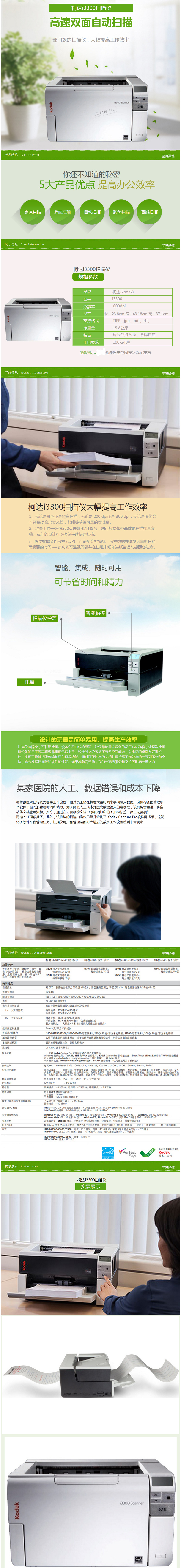 柯達(dá)(Kodak)掃描儀 i3300雙進(jìn)紙方式,A3,CCD,600×600dpi 掃描速度:70ppm,雙面140ipm掃描范圍:216x863mm,日掃描量:20000頁