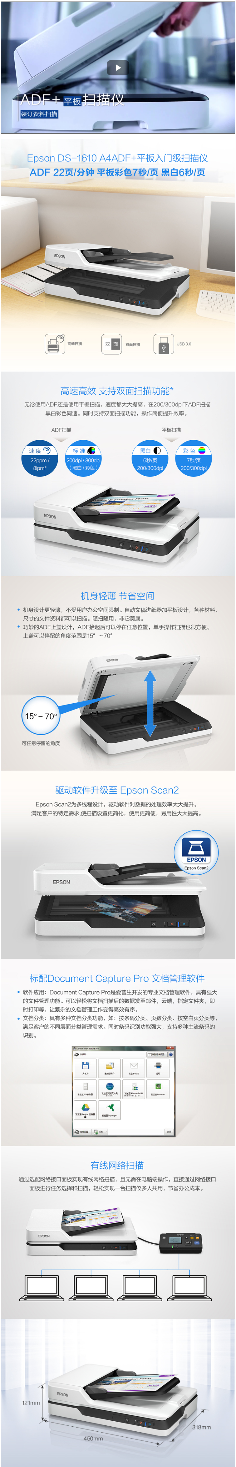 • 商品名稱:愛普生(Epson) DS-1610掃描儀 A4幅面 ADF+平板 22ppm高速彩色文檔掃描儀 自動進紙