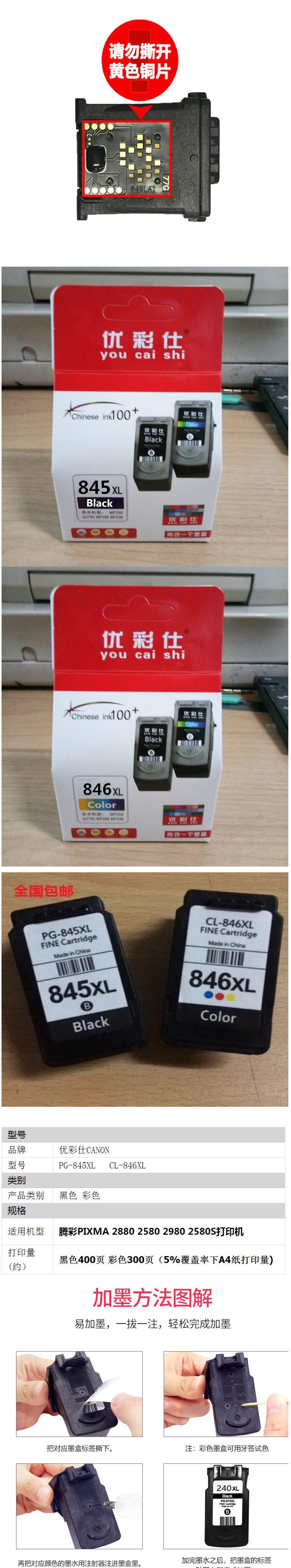 優(yōu)彩仕 CL-846XL墨盒 彩色 適用于 佳能MG3080/MG2580/MG2400/MG2500/MX498/iP288