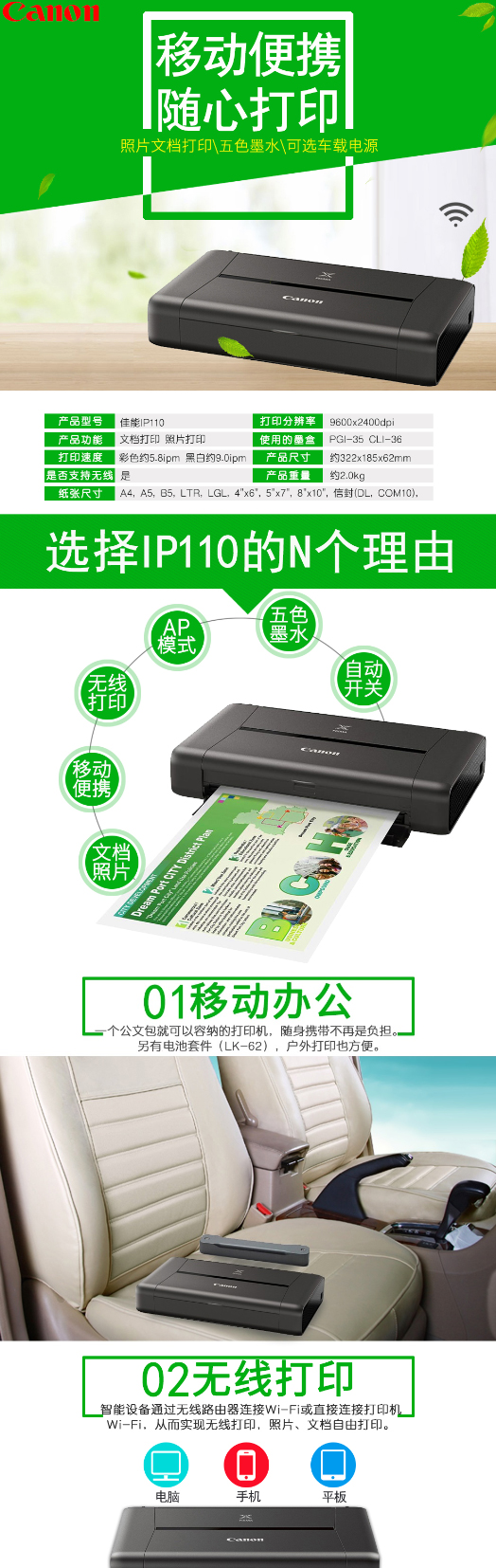 • 商品名稱:佳能(Canon)IP110(LK-62) 電池套裝 A4便攜式彩色打印機