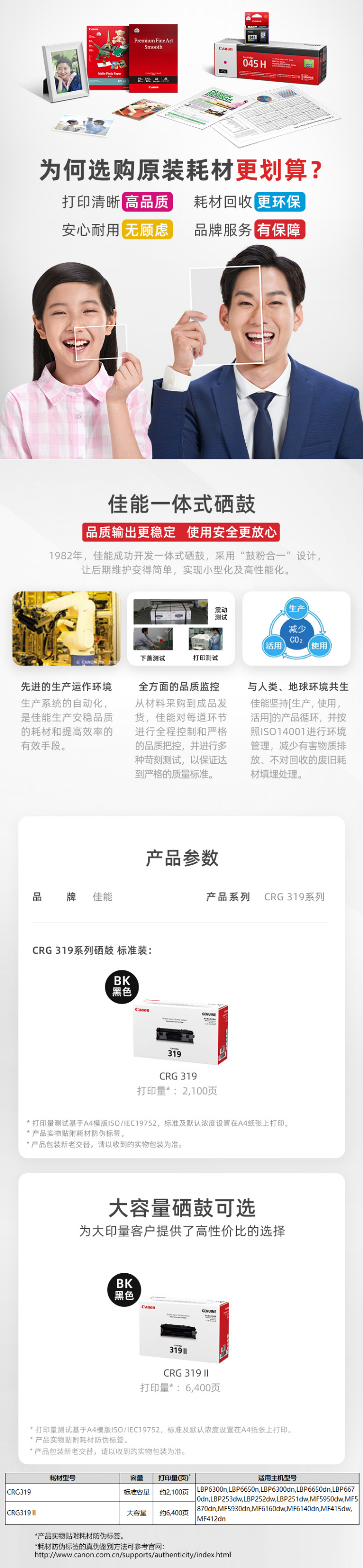 佳能(Canon) CRG 319 黑色硒鼓 打印量2100頁 適用于LBP253DW,LBP252DW,LBP251DW,LBP6670DN,LBP6300N,LBP6650N,LBP6300DN,LBP6650DN,MF415DW,MF412DN,MF6160DW,MF6140DN,MF5950DW,MF5870DN,MF5930DN