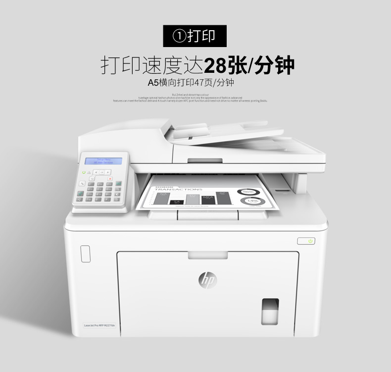 惠普(HP)A4黑白激光多功能一體機(jī)LaserJet Pro MFP M227fdn 打印 復(fù)印 掃描 傳真 自動(dòng)雙面 有線網(wǎng)絡(luò) 28ppm 分辨率1200×1200dpi 適用耗材:CF230A/CF230X/CF232A 鼓粉分離