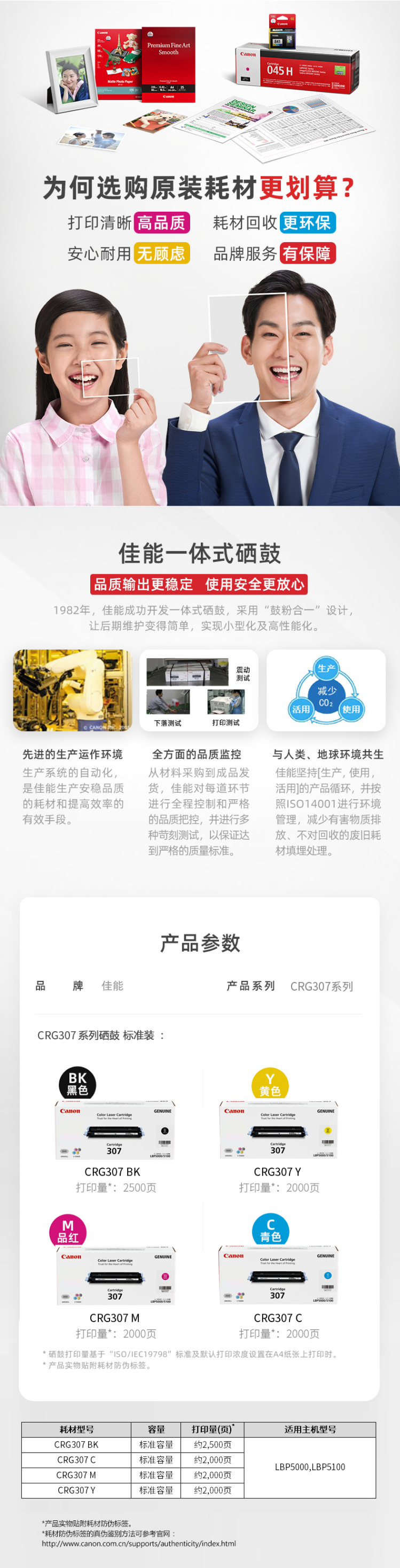 佳能(Canon) CRG 307 Y 黃色硒鼓 打印量2000頁 適用于LBP5000,LBP5100