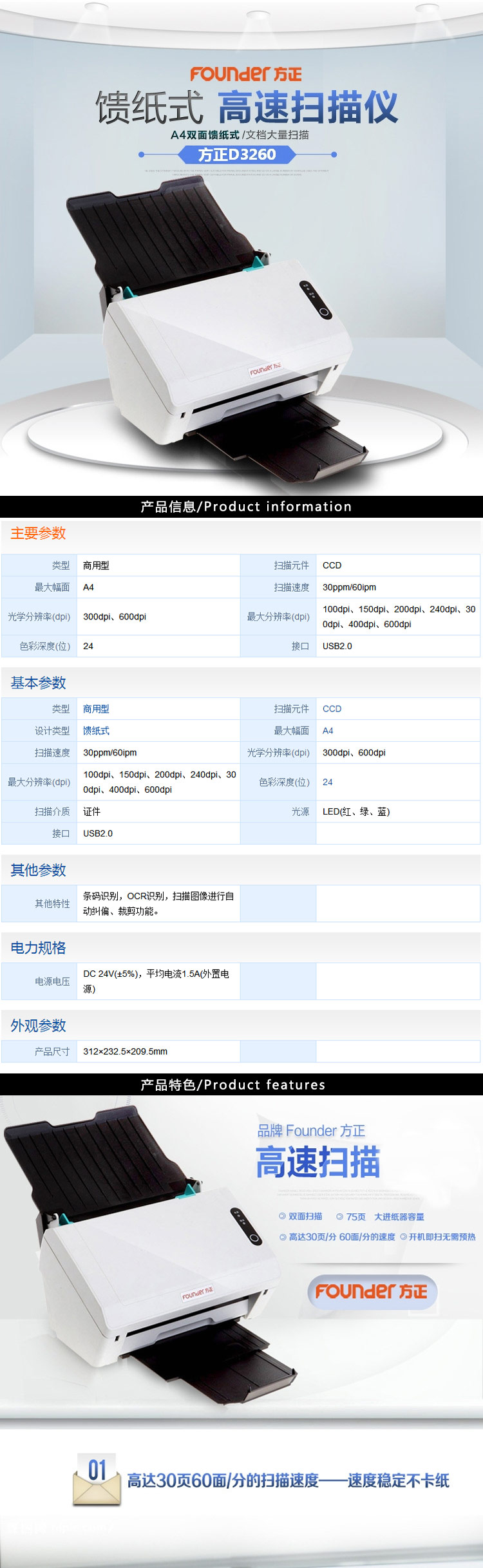 - 商品名稱(chēng):方正(Founder)A4饋紙式掃描儀D3260 自動(dòng)雙面 一年保修