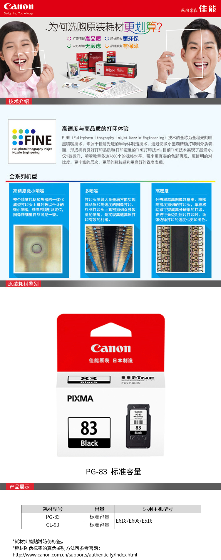 • 商品名稱:佳能(Canon) PG-83 黑色墨盒 打印量800頁(yè) 適用于E618、E608、E518