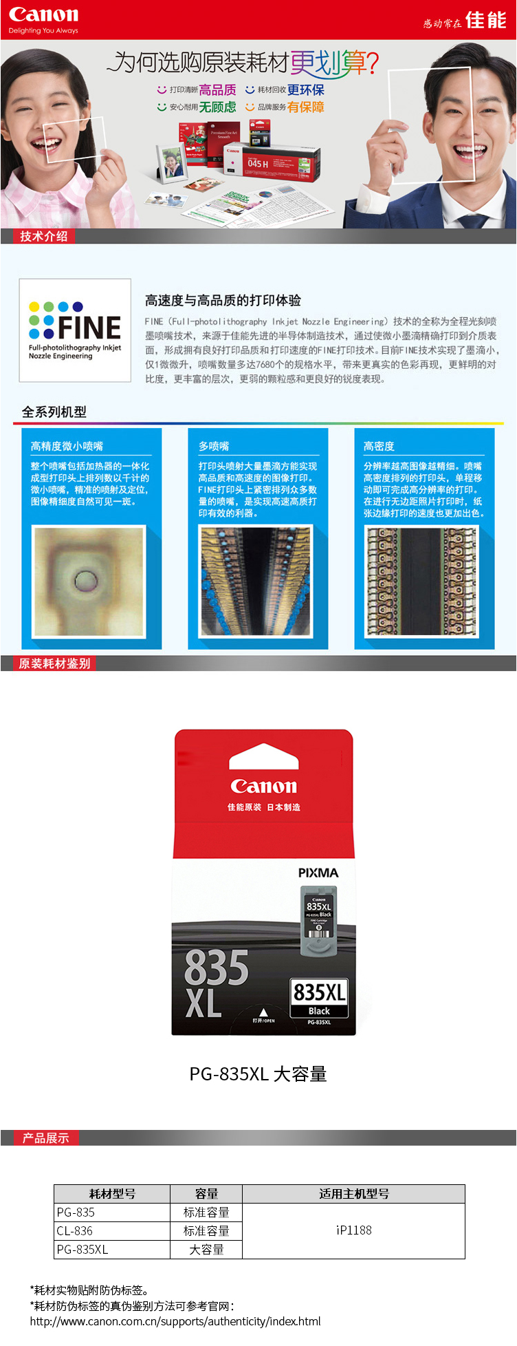 • 商品名稱:佳能(Canon) PG-835XL 大容量黑色墨盒 打印量298頁 適用于iP1188