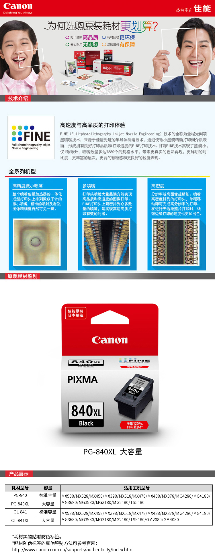 佳能(Canon) PG-840 XL 大容量黑色墨盒 打印量400頁 適用于MX538、MX528、MX458、MX398、MX518、MX478、MX438、MX378、MG4280、MG4180、MG3680、MG3580、MG3180、MG2180、TS5180