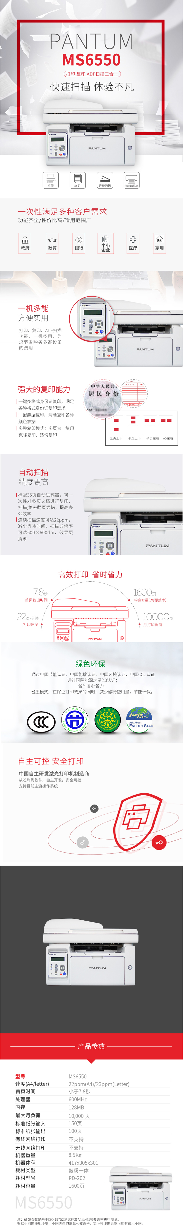 • 商品名稱:奔圖(PANTUM)MS6550 A4黑白激光打印機(jī) 打印/復(fù)印/掃描