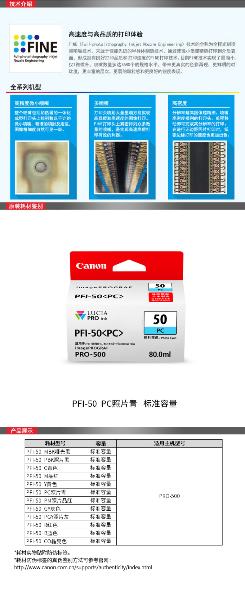 • 商品名稱:佳能(Canon) PFI-50 PC 照片青色墨盒 打印量580頁 適用于imagePROGRAF PRO-500