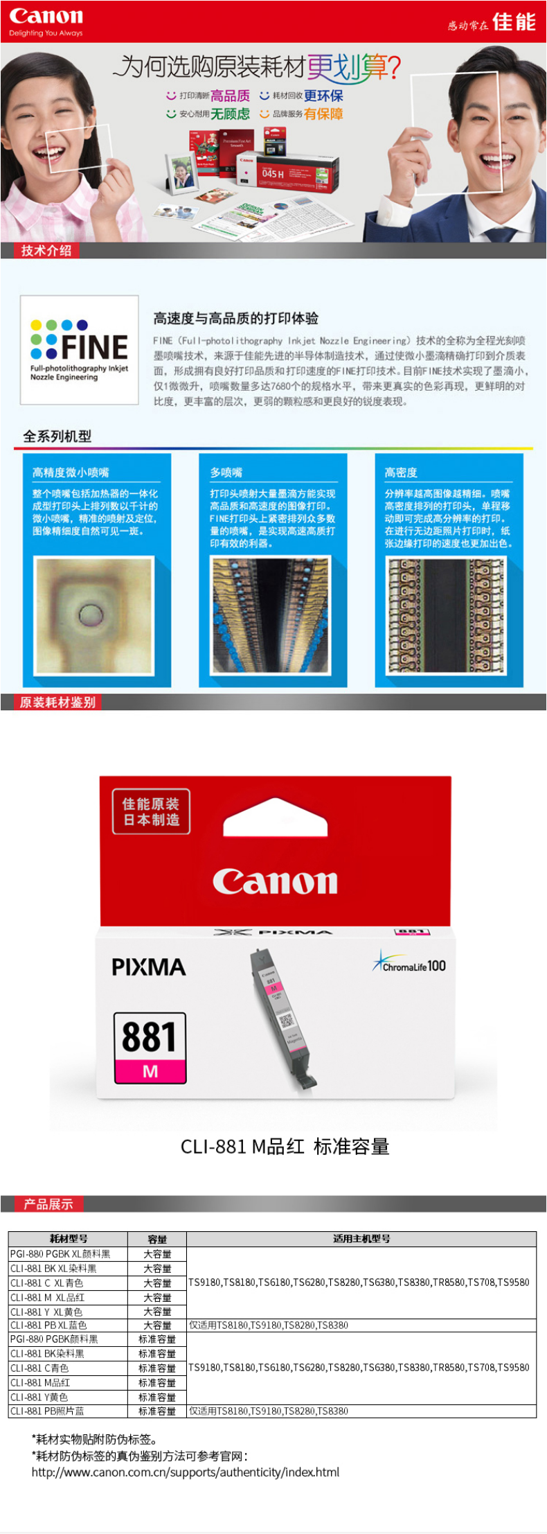 佳能(Canon) CLI-881 M 紅色墨盒 打印量250頁 適用于TS9180、TS8180、TS6180、TS6280、TS8280、TR8580、TS708、TS9580