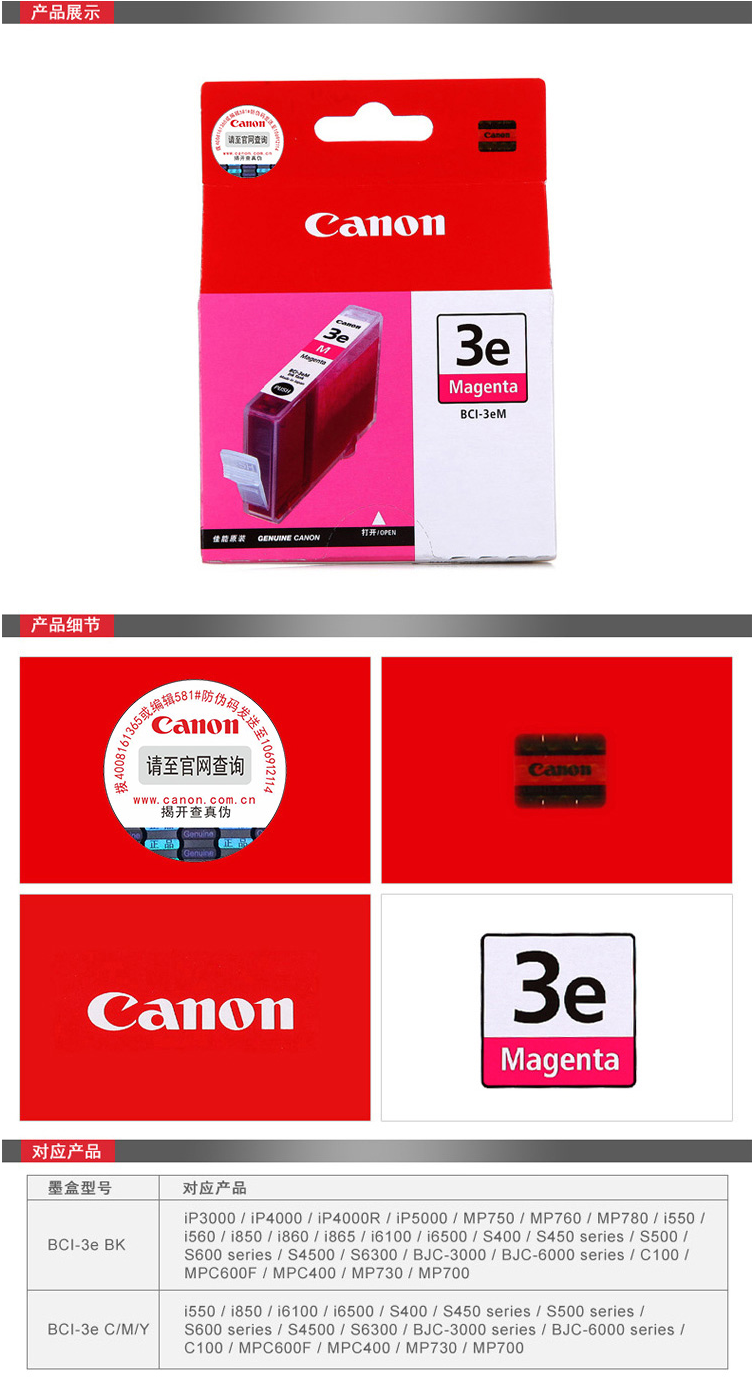 - 商品名稱:佳能(Canon) InkTank BCI-3e M 紅色墨盒 適用于i6500/i6100 MP730