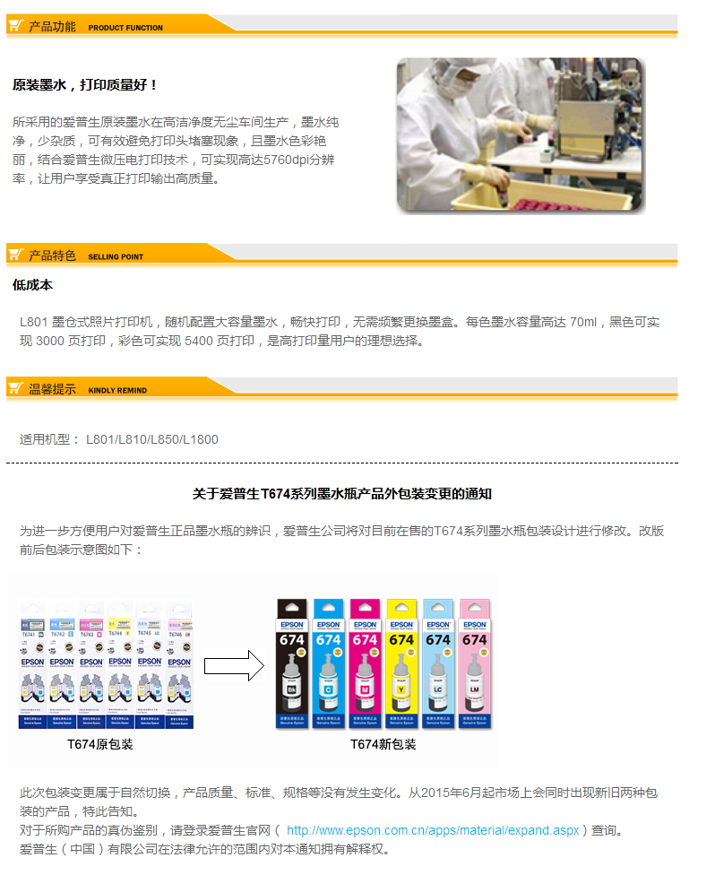 • 商品名稱:愛普生(Epson)T6741黑色墨水 C13T674180 適用于L801/L810/L850/L1800