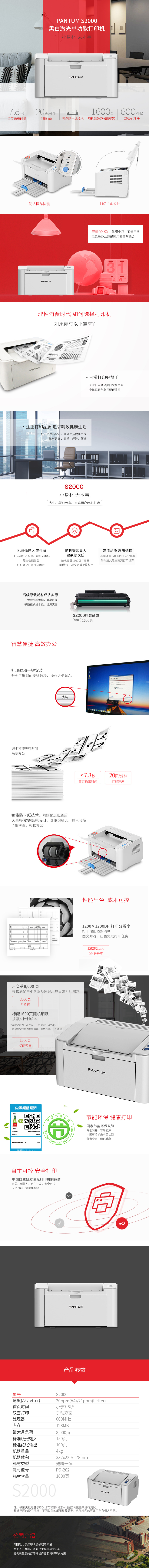 奔圖(PANTUM)A4黑白激光打印機S2000 打印速度20ppm 分辨率1200×1200dpi 手動雙面 不支持網(wǎng)絡(luò)功能 耗材PD-202