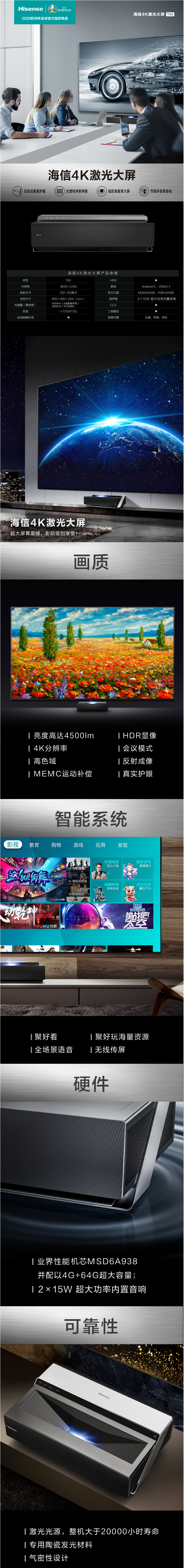 - 商品名稱:海信(Hisense)T60激光大屏 4500流明/3840*2160dpi/1500:1/150英寸抗光硬屏幕布/五年保修