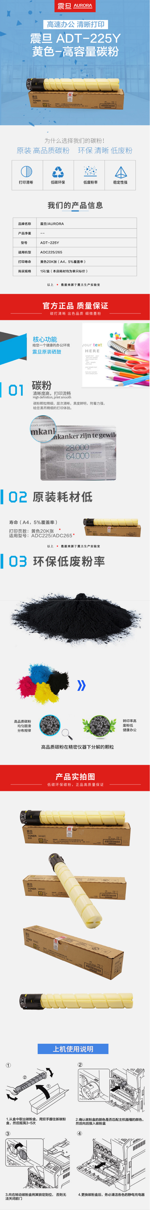 • 商品名稱:震旦(AURORA)ADT-225Y黃色-高容量碳粉 適用ADC225/265系列機型 約20000頁