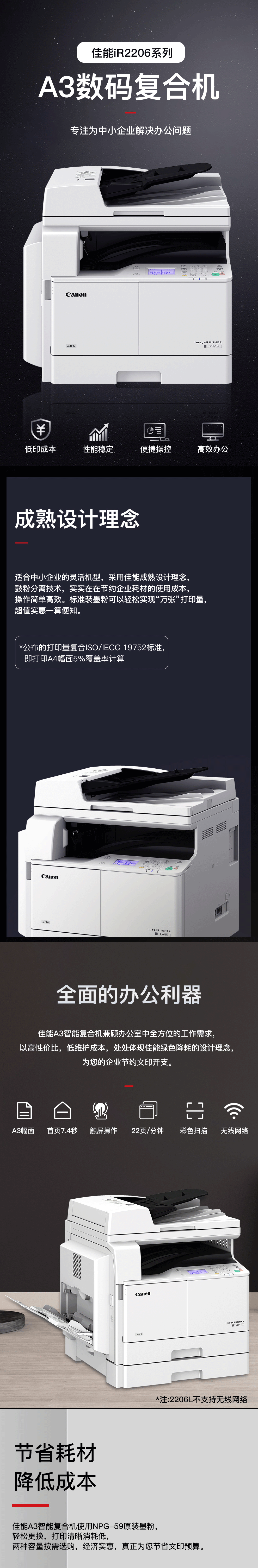 佳能(Canon)iR2206ad A3黑白數(shù)碼復(fù)合機(jī) 復(fù)印機(jī) 打印/復(fù)印/掃描/WiFi 含主機(jī) 輸稿器 工作臺(tái) 適用耗材:佳能 NPG-59 原裝墨粉