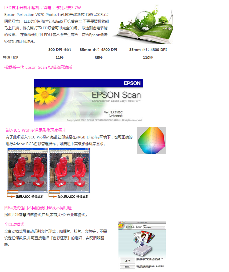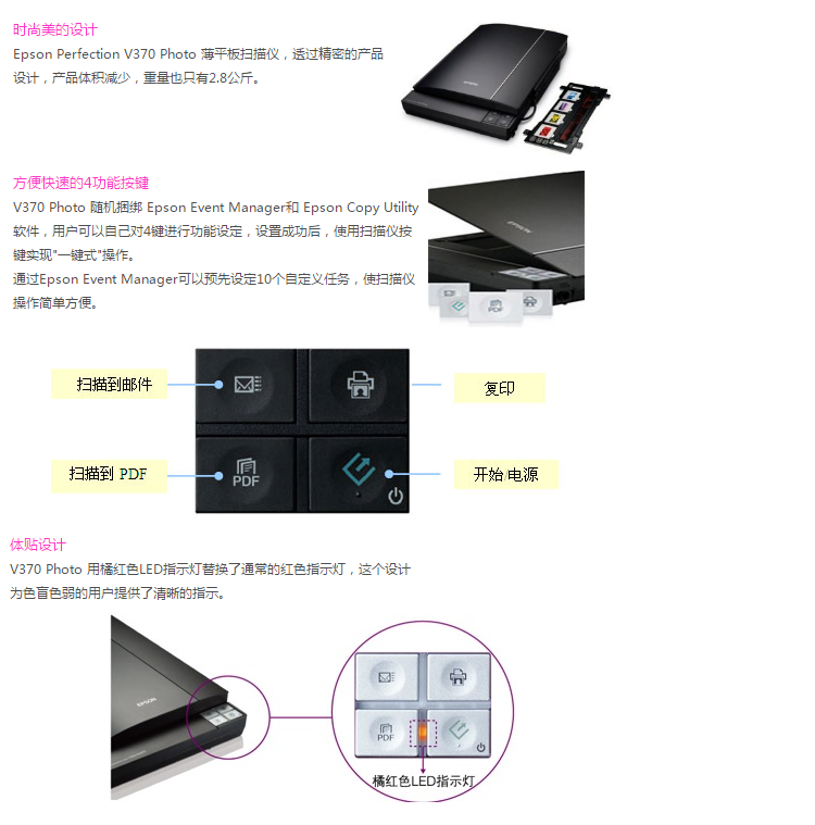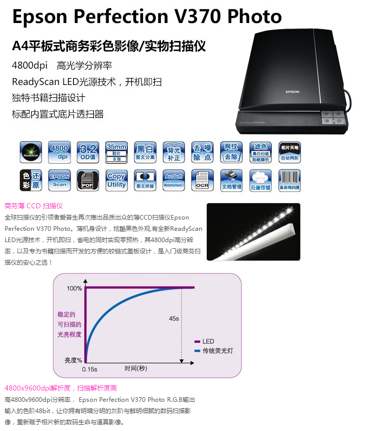 愛普生(EPSON)V370 平板式A4彩色掃描儀 4800×9600dpi 不支持網(wǎng)絡(luò) 16位色彩位數(shù) 手動(dòng)雙面