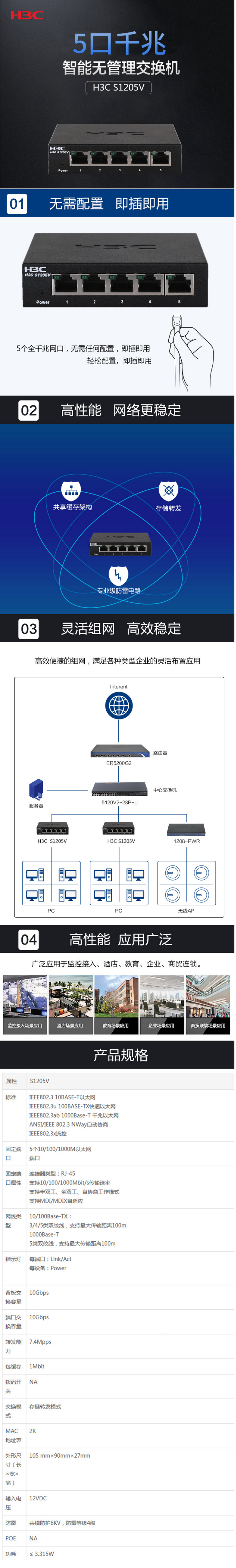 華三(H3C)S1205V 5口全千兆交換機 以太網交換機 非網管型 傳輸速率1000M
