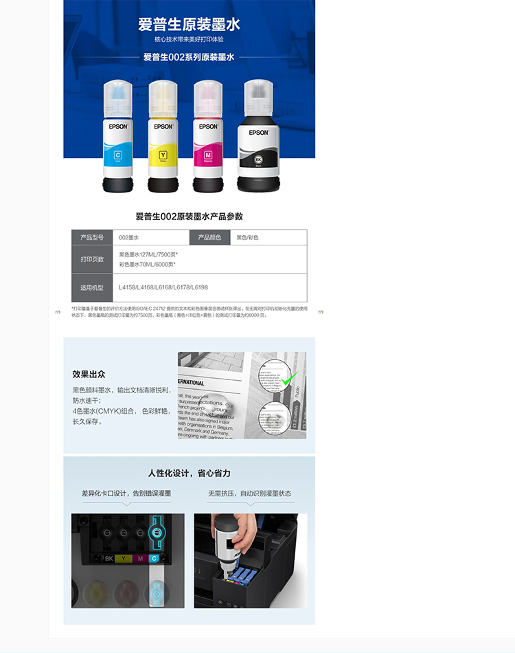 - 商品名稱:愛普生(Epson) 002系列墨水 T03X1-T03X4一套4色墨水 適用機型L415X/L416X/L616X/L617X系列及L6198