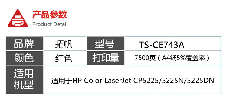 • 商品名稱:拓帆 TS-CE743A紅色硒鼓 打印量7500頁(yè) 適用于HP CP5225