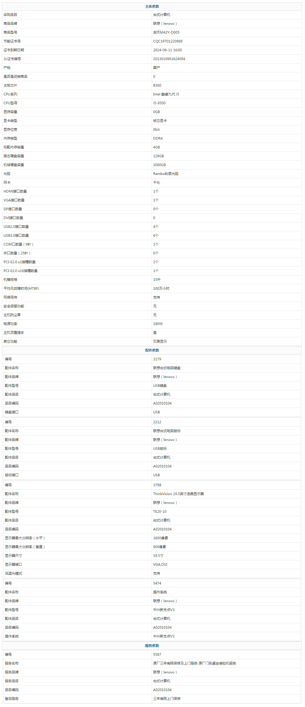 - 商品名稱:聯(lián)想(lenovo) 啟天M42Y-D005 Intel 酷睿九代 i5 i5-9500 4GB 1000GB 128GB 中興新支點(diǎn)V3 19.5寸 三年有限上門保修