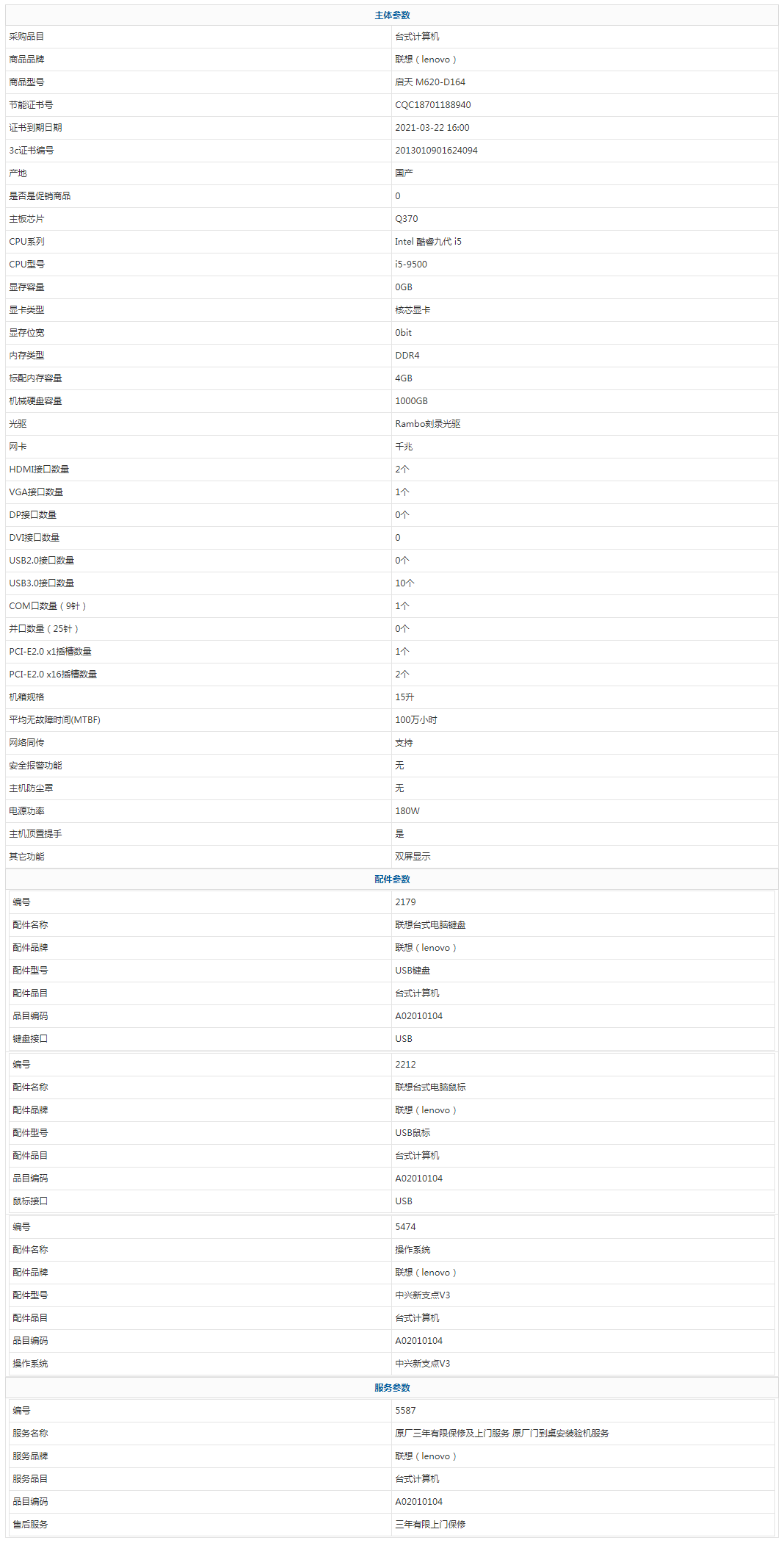 - 商品名稱:聯(lián)想(lenovo) 啟天 M620-D164 Intel 酷睿九代 i5 i5-9500 4GB 1000GB 中興新支點V3 三年有限上門保修