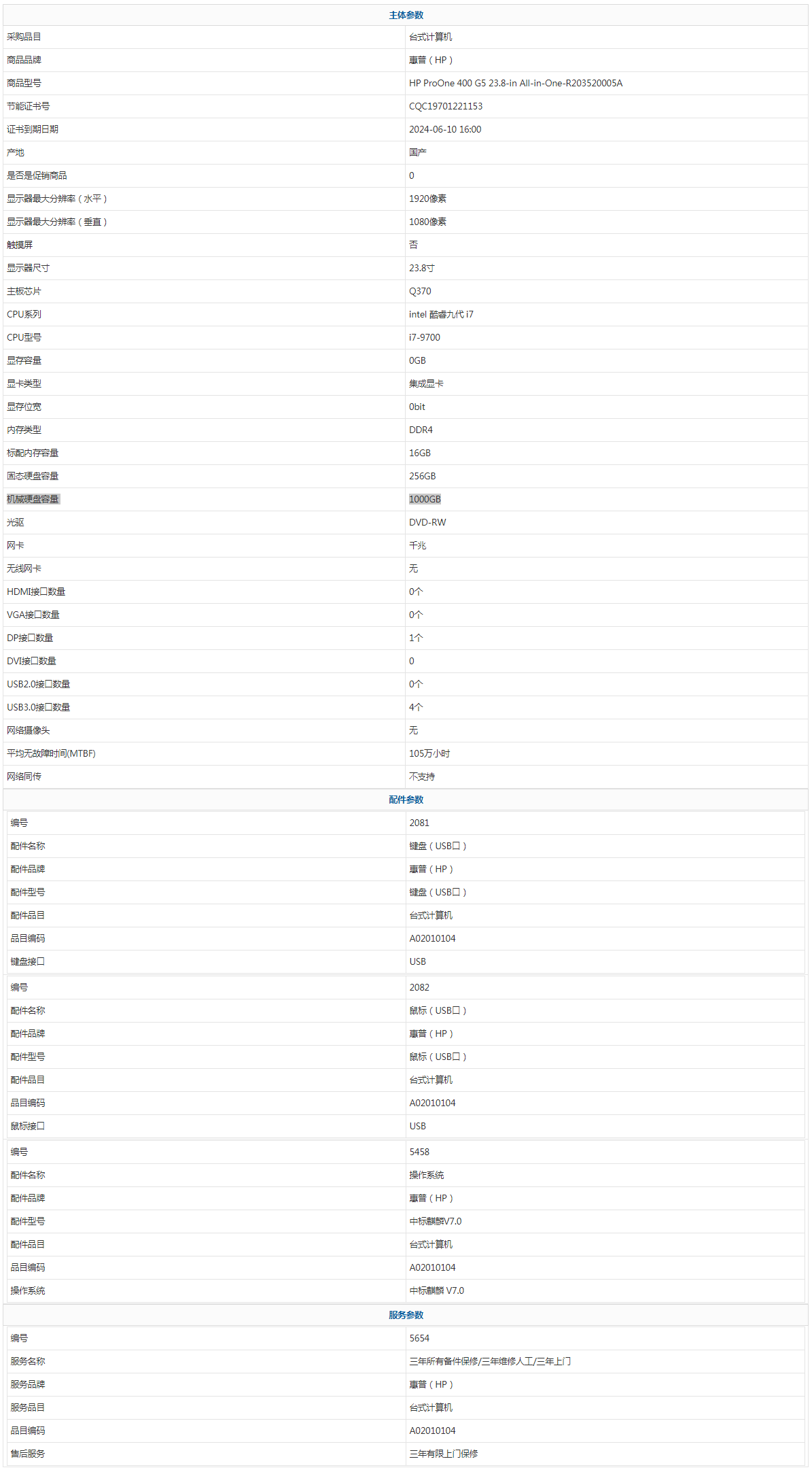 • 商品名稱:惠普(HP) HP ProOne 400 G5 23.8-in All-in-One-R203520005A intel 酷睿九代 i7 i7-9700 16GB 1000GB 256GB 中標(biāo)麒麟 V7.0 23.8寸 三年有限上門保修
