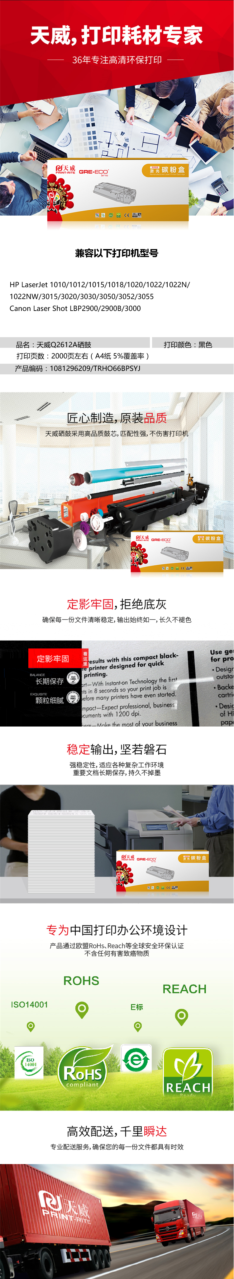 • 商品名稱:天威 PR-Q2612AG黑色硒鼓 打印量約2000頁 適用于惠普1010/1012/1015/1018/1022NW