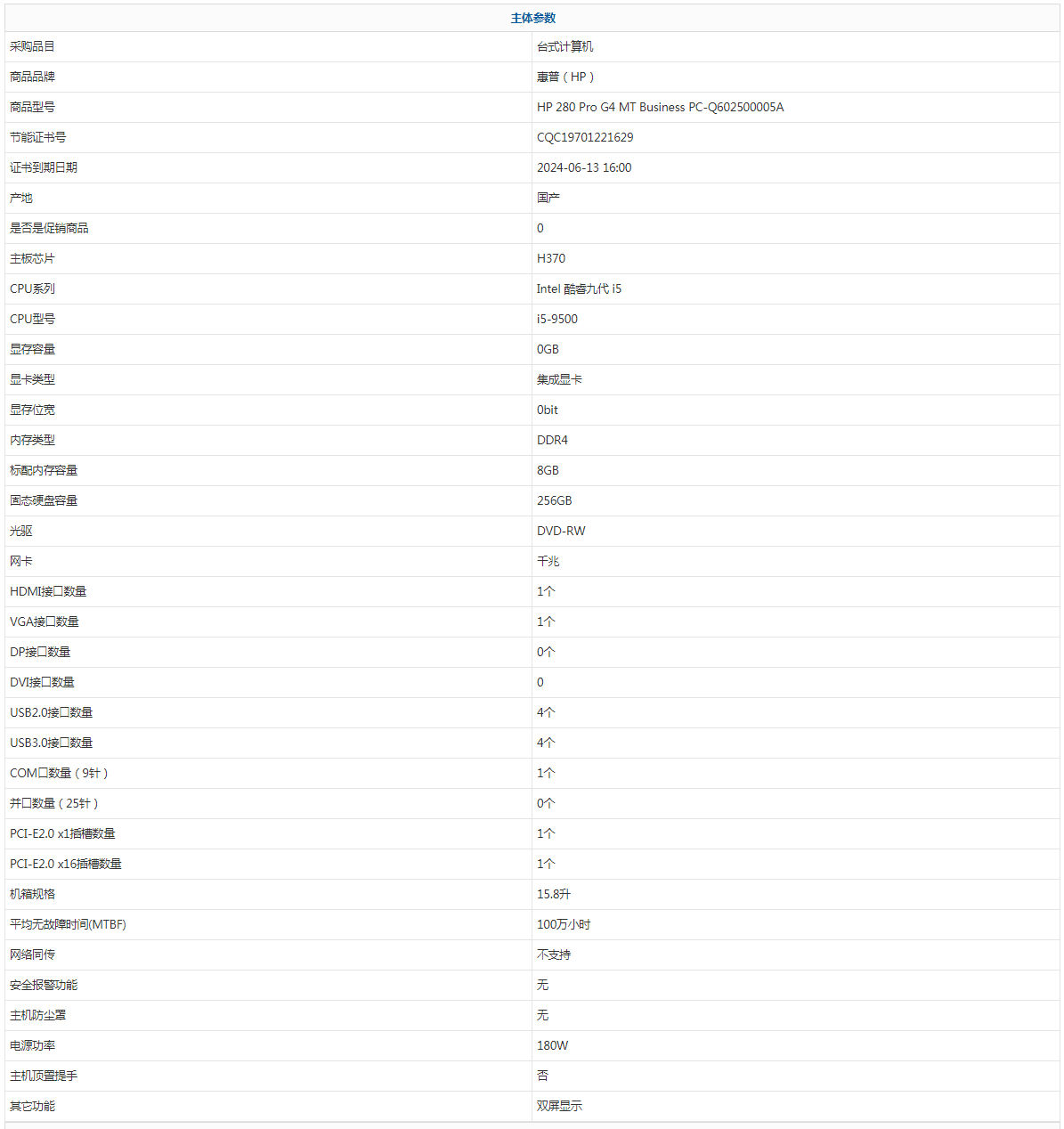 - 型號(hào):HP 280 Pro G4 MT Business PC-Q602500005A