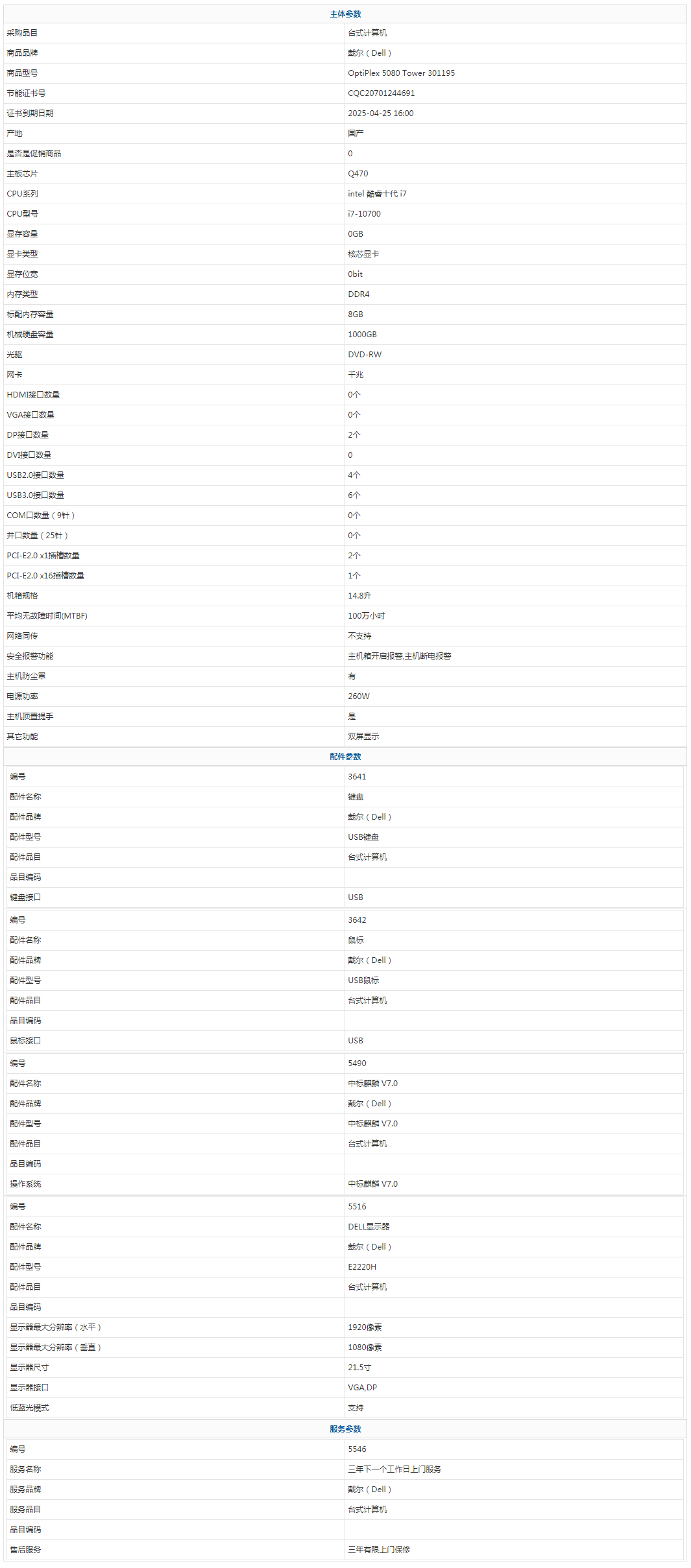 • 商品名稱:戴爾(Dell) OptiPlex 5080 Tower 301195 intel 酷睿十代 i7 i7-10700 8GB 1000GB 中標(biāo)麒麟 V7.0 21.5寸 三年有限上門保修