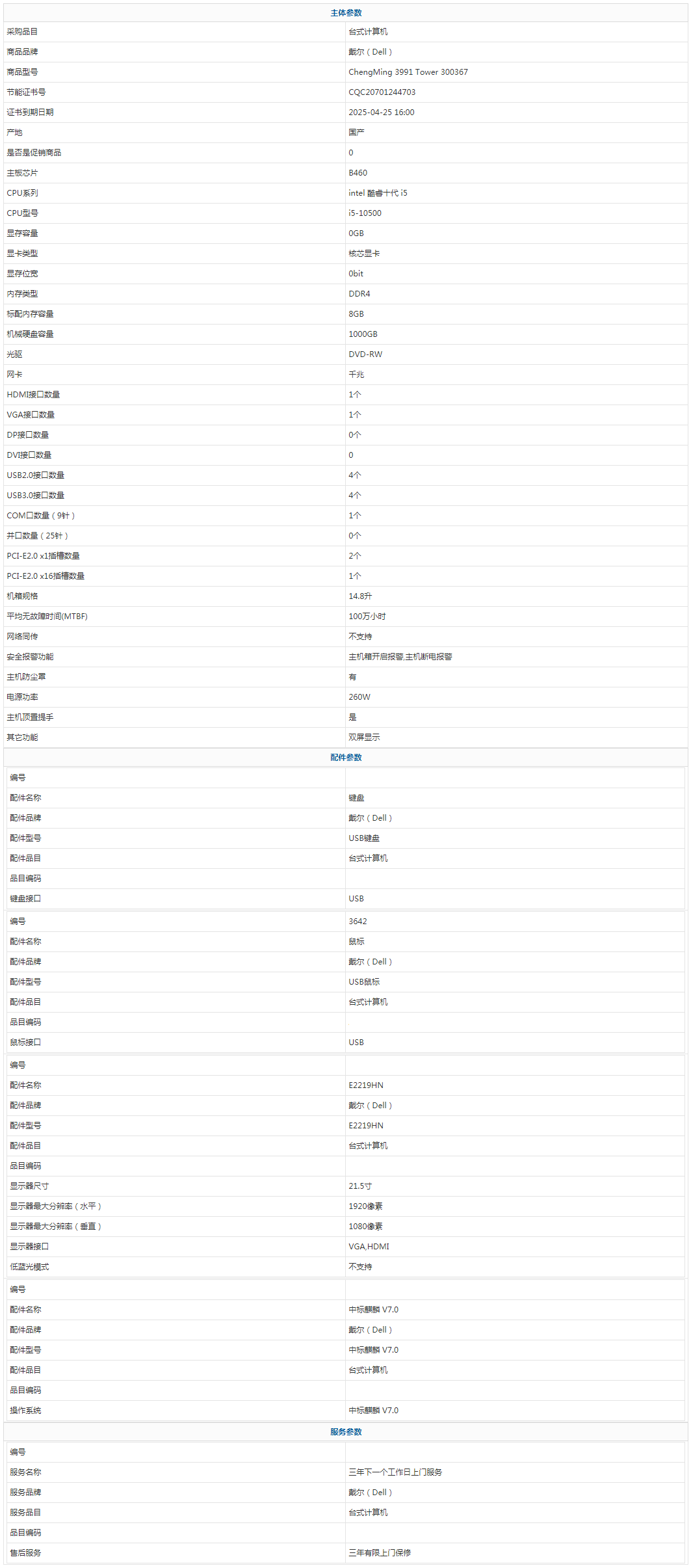 • 商品名稱:戴爾(Dell) ChengMing 3991 Tower 300367 intel 酷睿十代 i5 i5-10500 8GB 1000GB 中標(biāo)麒麟 V7.0 21.5寸 三年有限上門保修