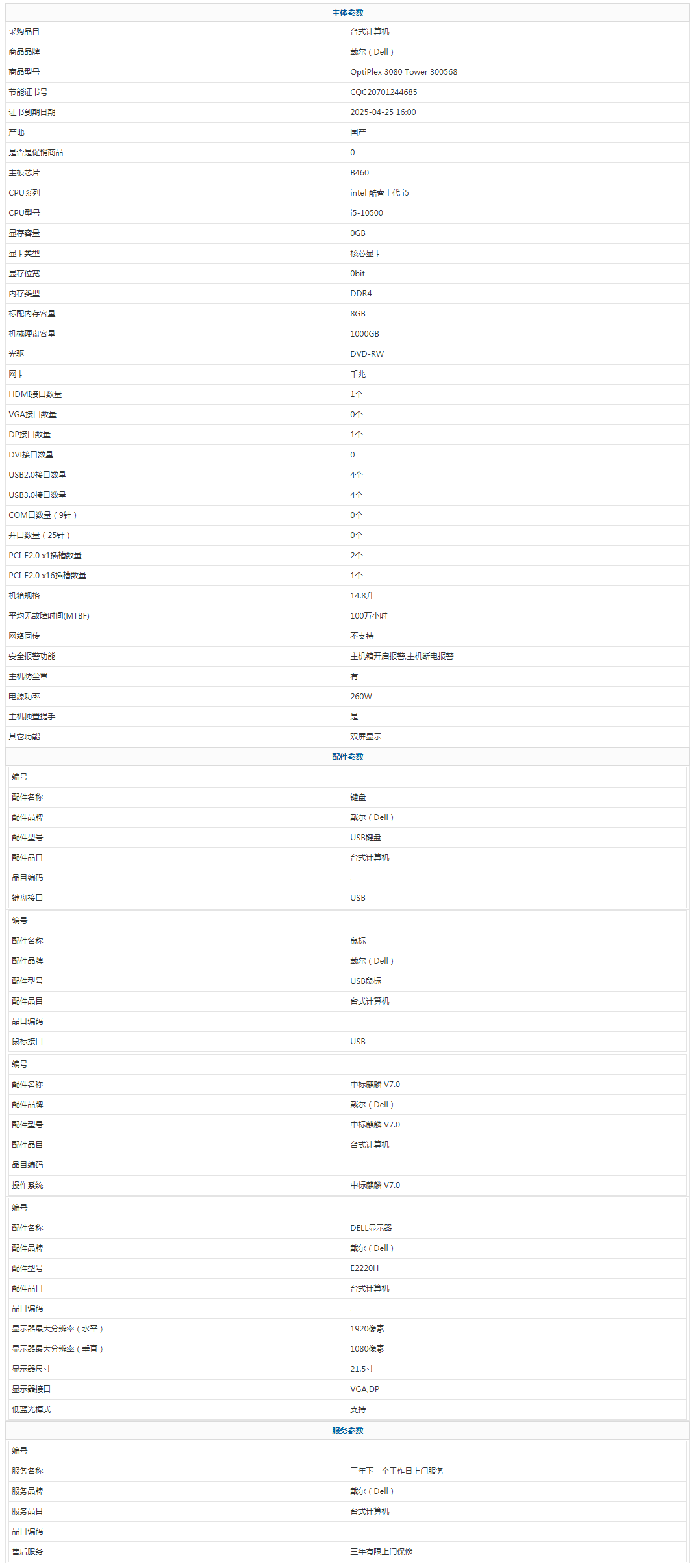 - 商品名稱:戴爾(Dell) OptiPlex 3080 Tower 300568 intel 酷睿十代 i5 i5-10500 8GB 1000GB 中標(biāo)麒麟 V7.0 21.5寸 三年有限上門保修